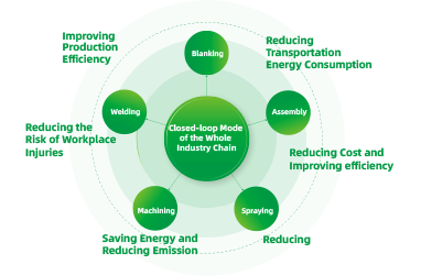 L'ensemble de la chaîne industrielle est une boucle fermée, utilisant la numérisation pour réaliser des processus technologiques tels que le découpage automatique, la soudure, l'usinage, la pulvérisation, l'assemblage final, etc. Cela permet de réduire les coûts, d'améliorer la qualité et l'efficacité, et de promouvoir l'écologie et de faibles émissions de carbone de transformation.
