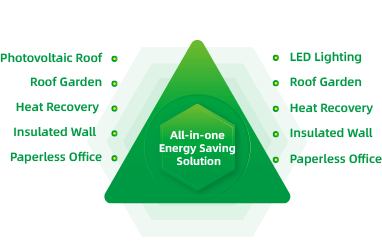 Des solutions d'économie d'énergie intégrées ont été mises en place : panneaux de toit photovoltaïque, éclairage naturel, couverture végétale dans la zone de bureaux, jardin sur toit, récupération de chaleur, récupération de l'eau de pluie, isolation thermique, éclairage LED, robinet à capteur, bureau sans papier, etc., pour créer une zone verte aussi complète que possible.